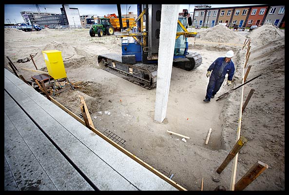 Nog even positioneren op een oranje markeringspaaltje en de bouw kan beginnen!
